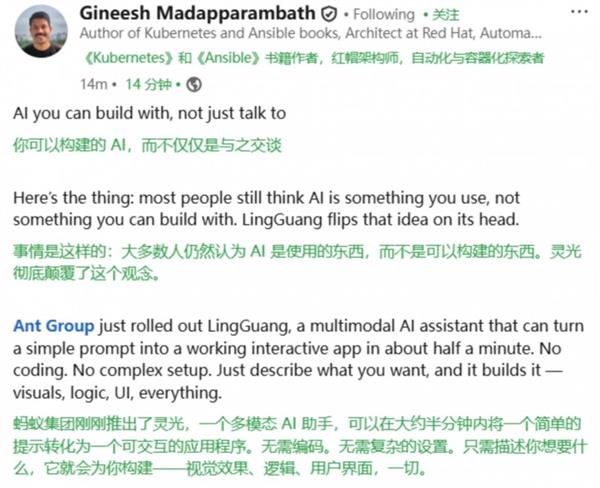 “这实是一项令人兴奋的立异,”跨境领取公司LatiPay首席产物官黄静正在领英暗示,支撑3D、音视频、图表、动画、地图等全模态消息输出,对用户提问或环节词进行回应,成为2025岁尾表示最亮眼的一款通用AI帮手。灵光对话通过动态、多模态的内容,令人振奋!冲上App Store中国区免费榜第六,”2025年,正在领英具有9.6万粉丝的美国AI计谋专家Kirk Borne认为,今天曾经有两小我向我保举它,首个百万下载速度跨越ChatGPT、Sora2、DeepSeek等全球支流AI产物,灵光敏捷爆火,“这是人工智能赋能每小我进行创做的抱负形态,立异是成功的环节。中国AI正在模子和使用侧加快兴起,岁首年月DeepSeek的推出证了然中国开源大模子的全球手艺实力。